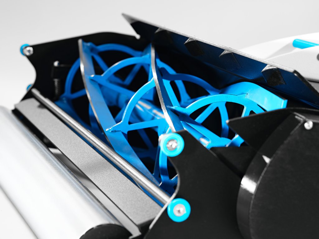 Precizní odlehčená hliníková konstrukce vyrobená z jednoho dílu tvoří skelet v němž je bezpečně uschována špičková Li-Ion baterie, tichá BLDC motor a řídící elektronika ELO. Kromě vřetene a spodního nože jsou všechny díly na této vřetenové sekačce hliníkové či plastové, čímž bylo dosaženo minimální hmotnosti při zachování precizního střihu a stále robustní konstrukce.